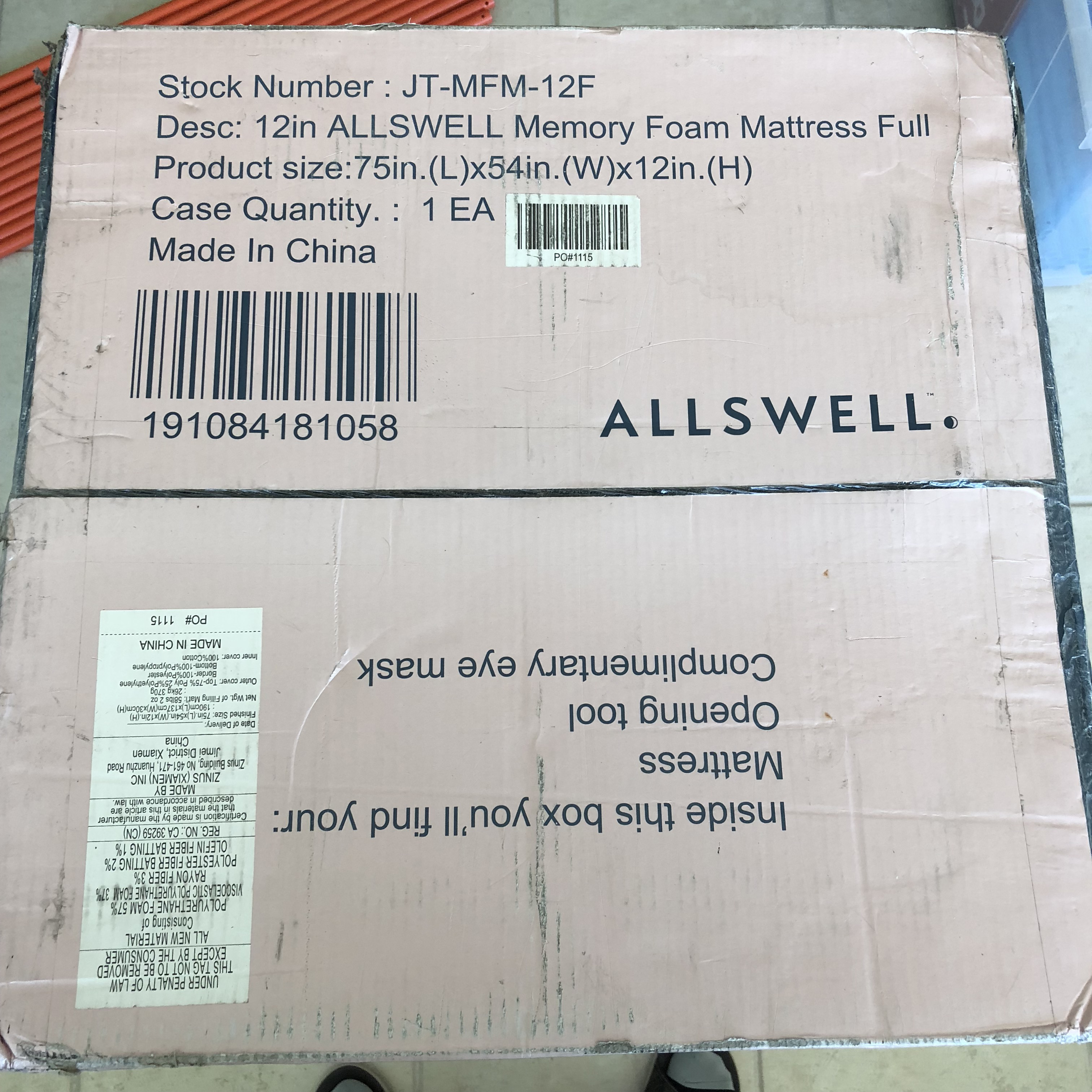 The box for the mattress, which was pretty beat up but not punctured as the cardboard is quite sturdy